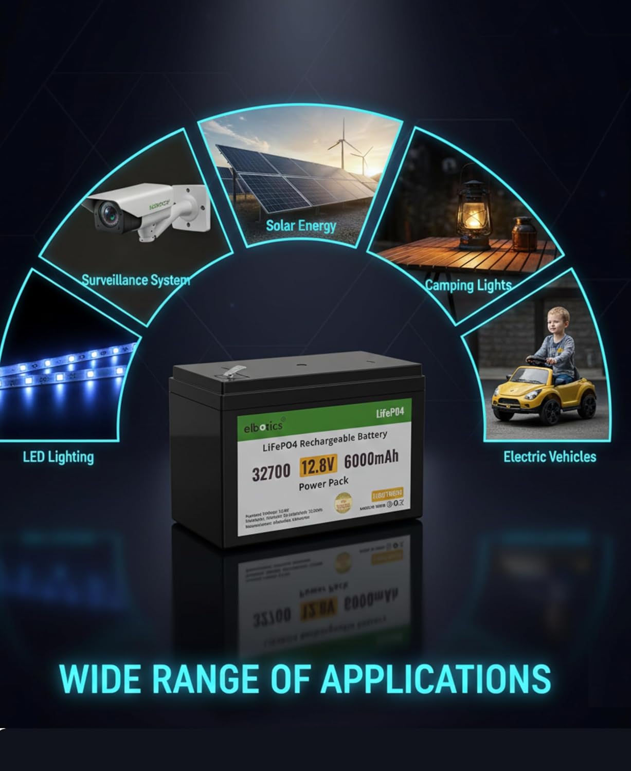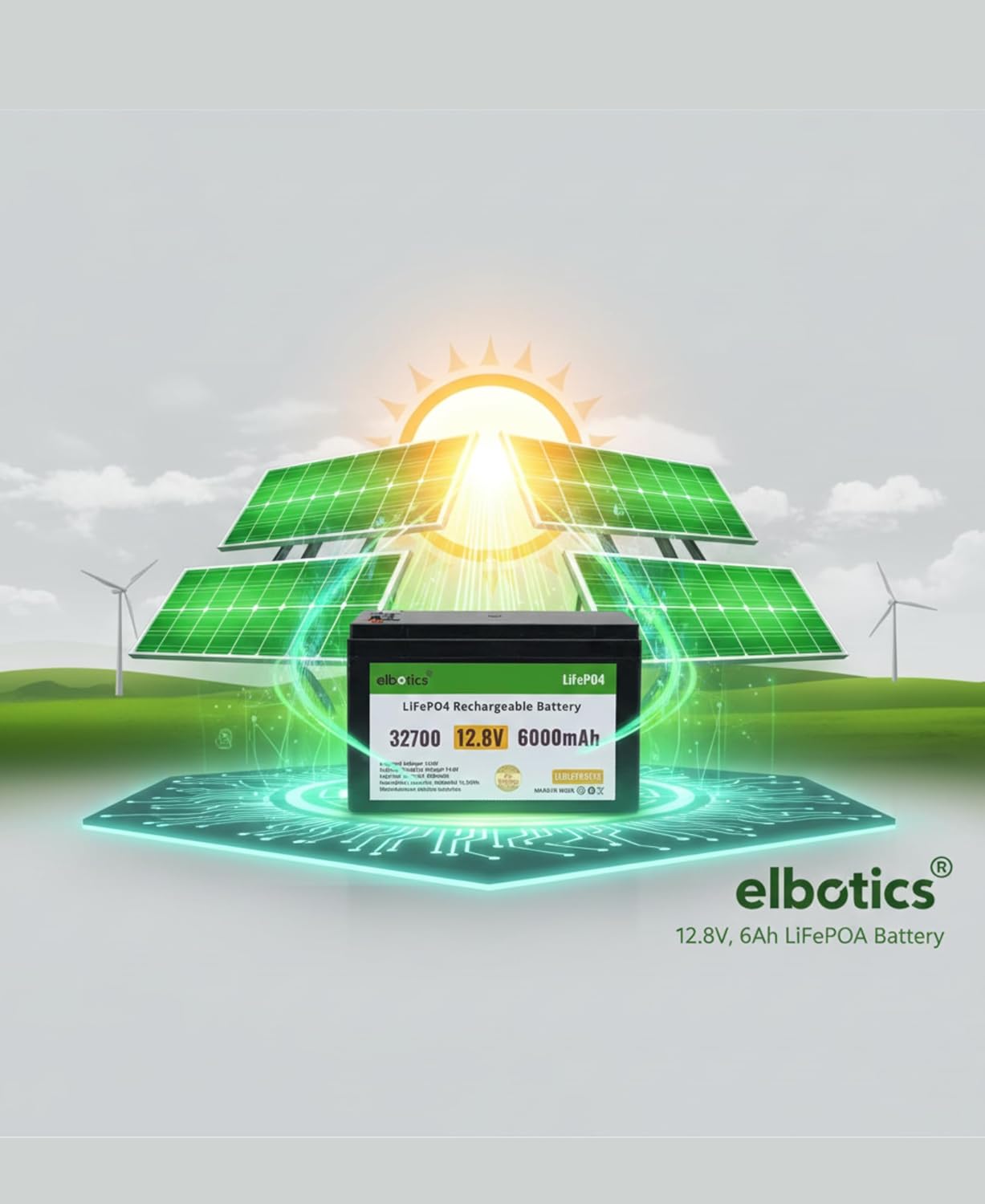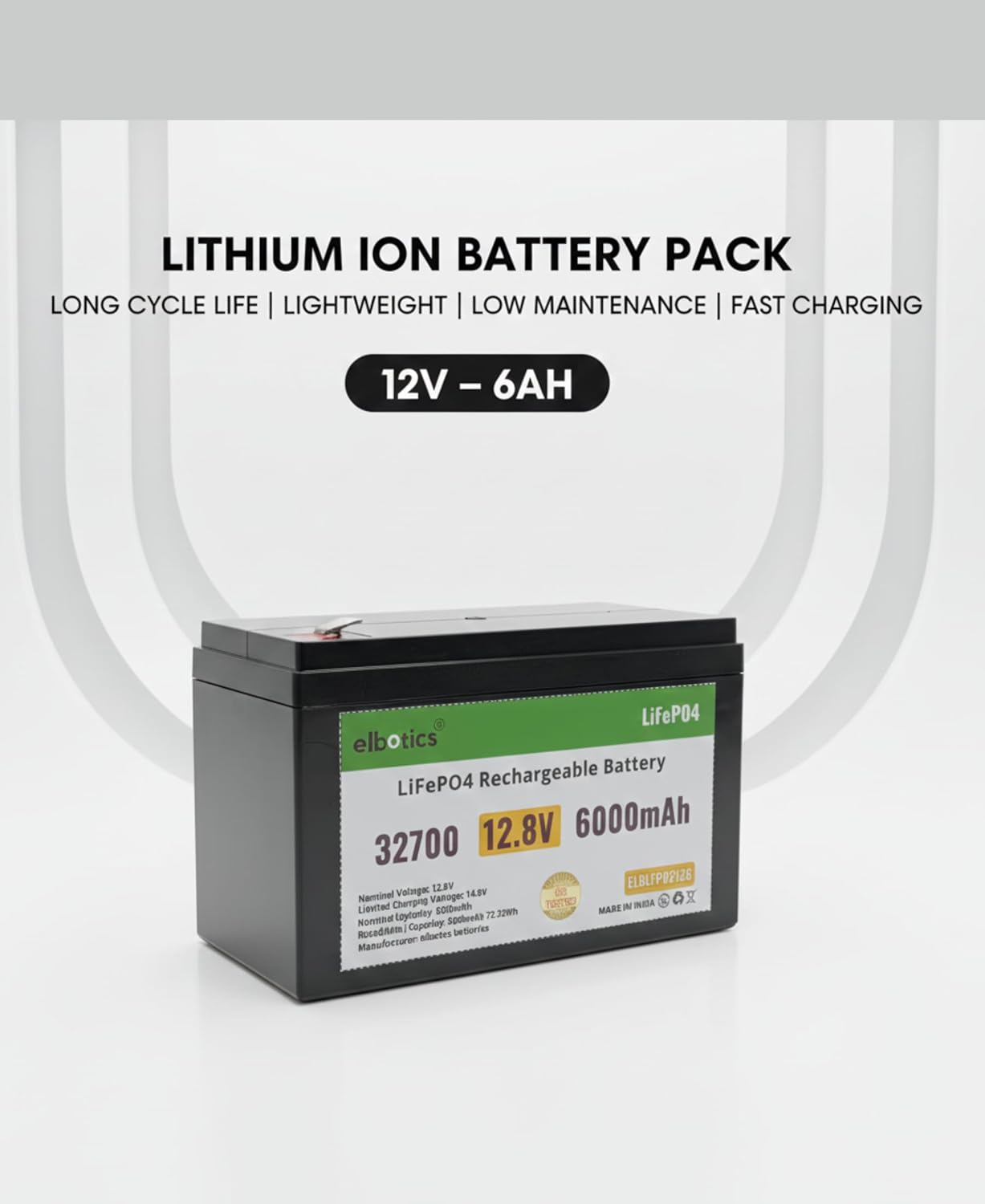 The ELBOTICS 12V/12.8V 6Ah LiFePO4 Rechargeable Battery is engineered for long-lasting performance, high safety, and exceptional durability. Built with Grade-A Lithium Iron Phosphate cells, this battery delivers more than 2000 deep charge cycles, giving it a service life of up to 3 years, which is nearly 8 times longer than standard lead-acid batteries. The integrated 10A Smart BMS (Battery Management System) protects the battery from overcharge, over-discharge, short circuit, over-current, overload, and high temperatures, ensuring safe and stable operation in all conditions. Despite its powerful output, the battery weighs only 866g, making it incredibly lightweight and easy to install in portable and outdoor equipment. With support for both series and parallel expansion, users can connect multiple batteries for increased capacity or higher voltage—ideal for solar energy storage, camping power stations, motorhomes, and DIY power systems. Its wide application range includes fish finders, golf carts, trolling motors, lawn mowers, UPS backup, emergency lighting, radios, kayaks, and children’s ride-on vehicles. Designed for performance in extreme temperatures (Charging: 0°C–50°C, Discharging: –20°C–55°C), the ELBOTICS LiFePO4 12.8V 6Ah battery ensures reliable power wherever you go. Eco-friendly, maintenance-free, and built with high safety standards, it is the perfect long-lasting upgrade for all your 12V devices.